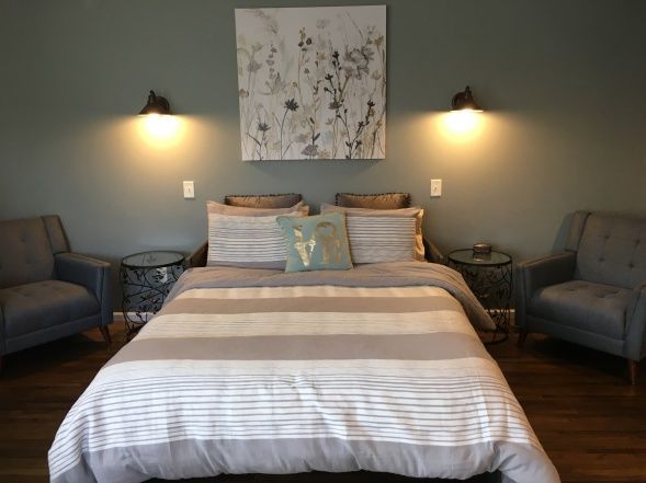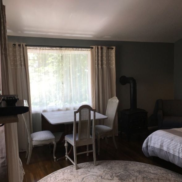This is our largest room with all the amenities a suite can offer. Relax in a light filled room in soft hues of greys, blues and beiges. Two large windows display a lovely view overlooking the valley. After a relaxing rain shower in the large bathroom, you can enjoy the free-standing stove that adds warmth and coziness on those snowy wintery days. This suite offers a King size bed and has its own microwave, mini fridge and keurig coffee machine, equipped with coffees, cider and hot chocolate. Relax in the ambience of cozy cottage décor. enjoy the lovely views and a scrumptious treat.